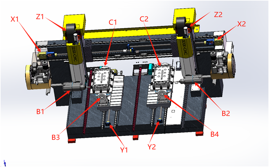 數(shù)控系統(tǒng)(新代220MB-5 ); X1X2軸(7.5KW 48Nm)伺服電機(jī); Y1Y2軸(5.9KW 28.4Nm)伺服電機(jī); Z1Z2軸(5.5KW 35Nm)伺服電機(jī)、帶抱閘; B1B2軸(5.9KW 28.4Nm)伺服電機(jī); B3B4軸(5.9KW 28.4Nm)伺服電機(jī); C1C2軸液壓控制旋轉(zhuǎn); 2-主軸電機(jī)15-18000; |